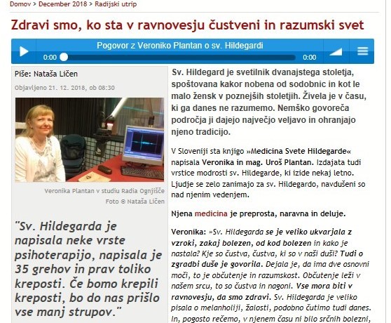 Radio Ognjišče: Veronika Plantan, soavtorica knjige medicina svete Hildegarde, ki je pravkar izšla. Oddajo lahko poslušate tu. Vsebina knjige